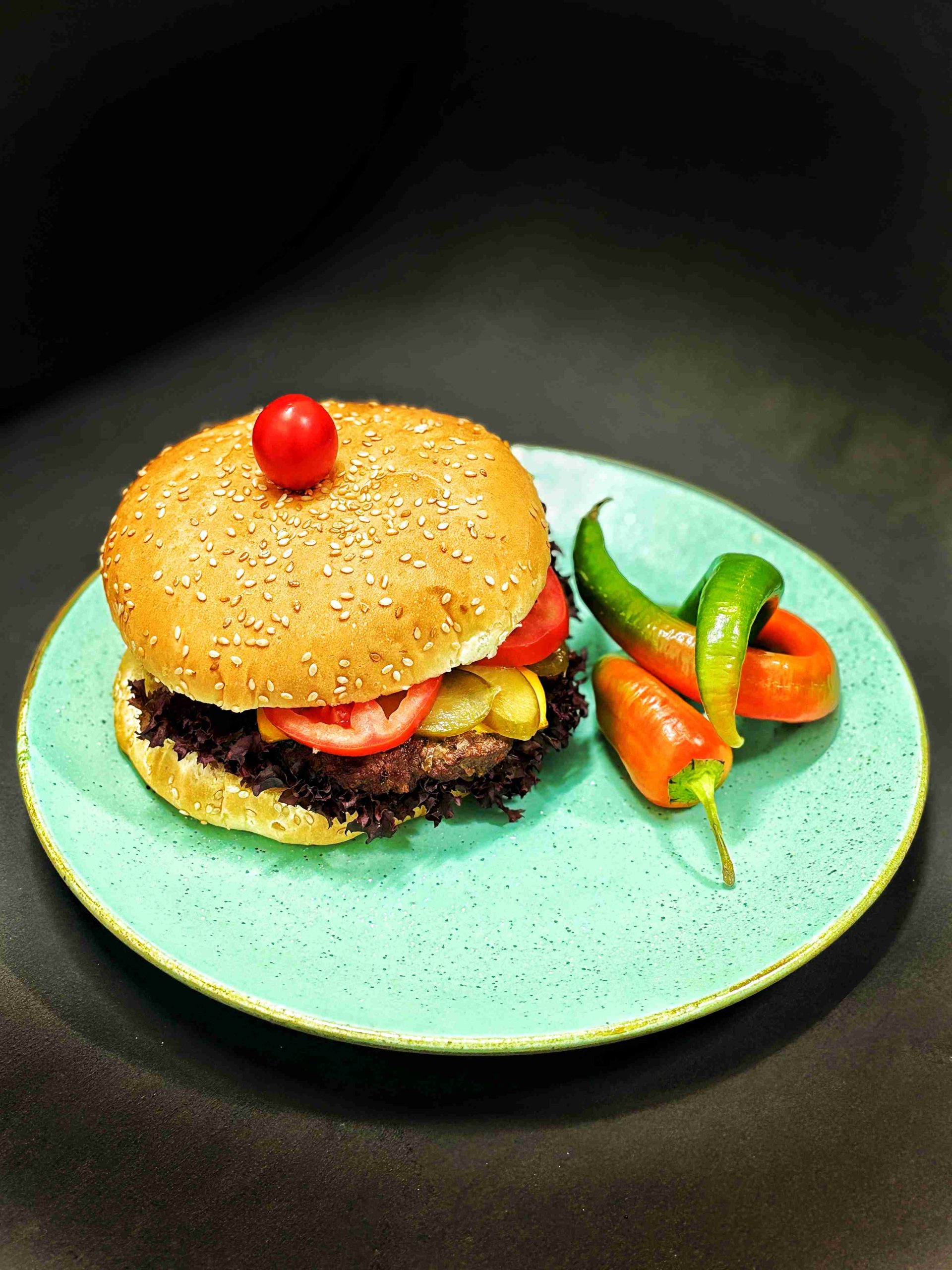 یک لایه برگر دست ساز با گوشت گوساله تازه ، باسس فلفل هالوپینو تند و آتشین