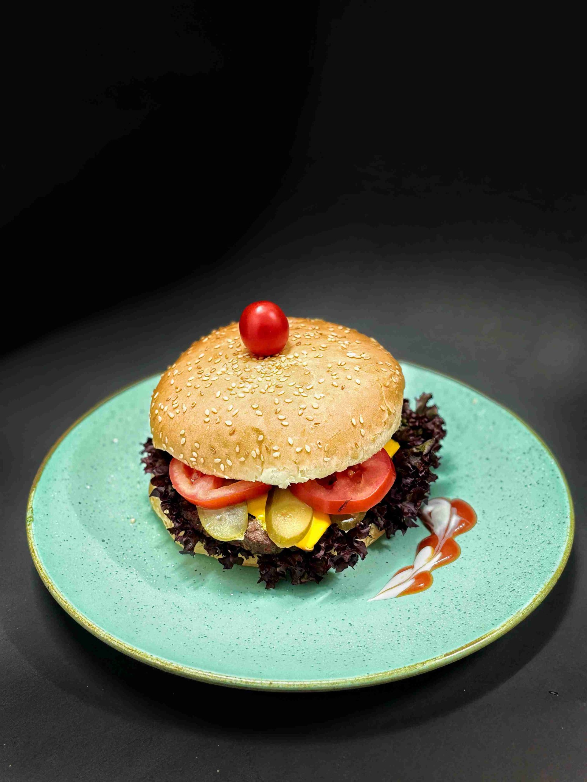 یک لایه برگر دست ساز با گوشت گوساله تازه ، در میان پنیر نرم و طلایی و پنیر گودا ذوب شده و دورچین