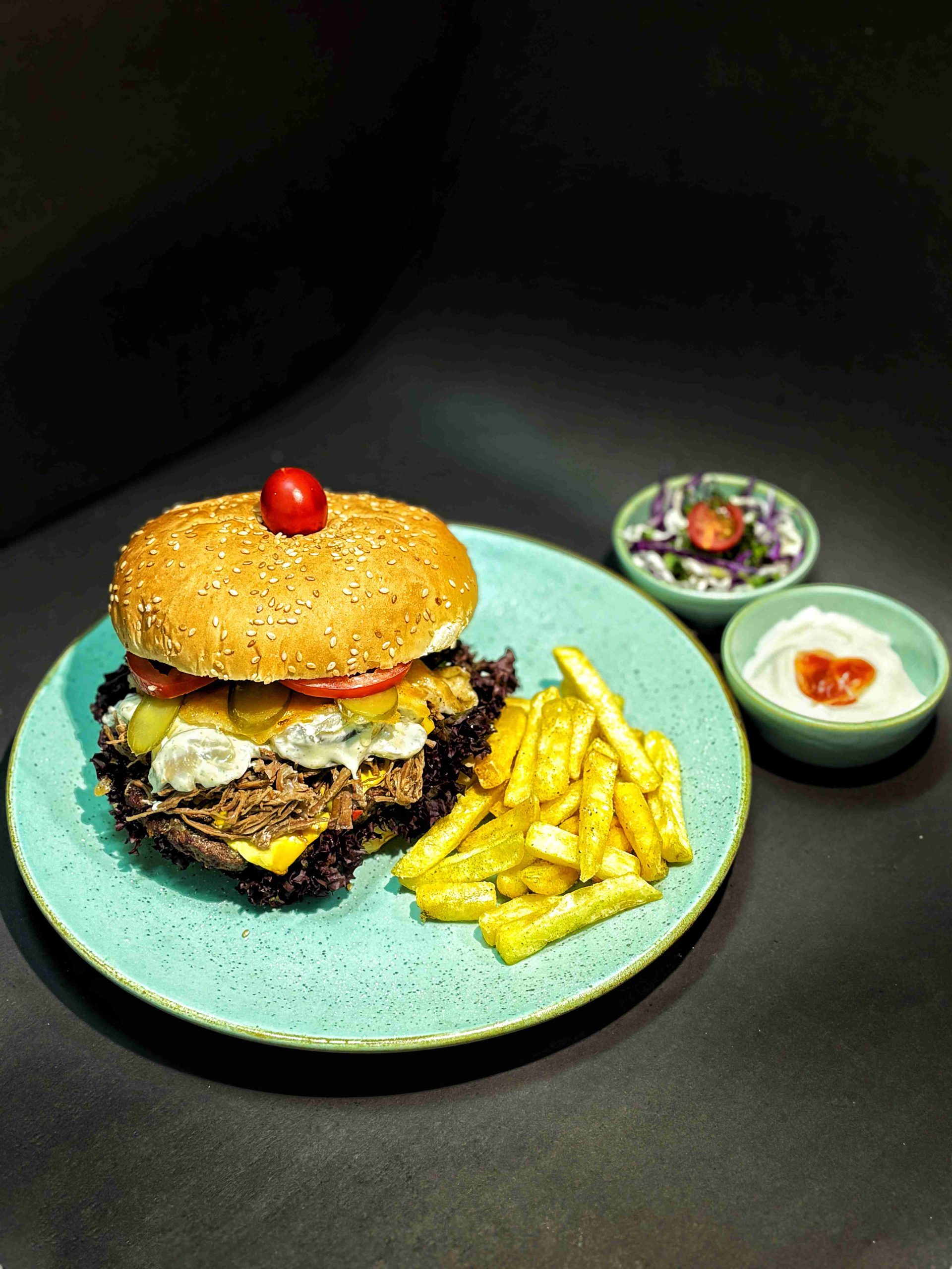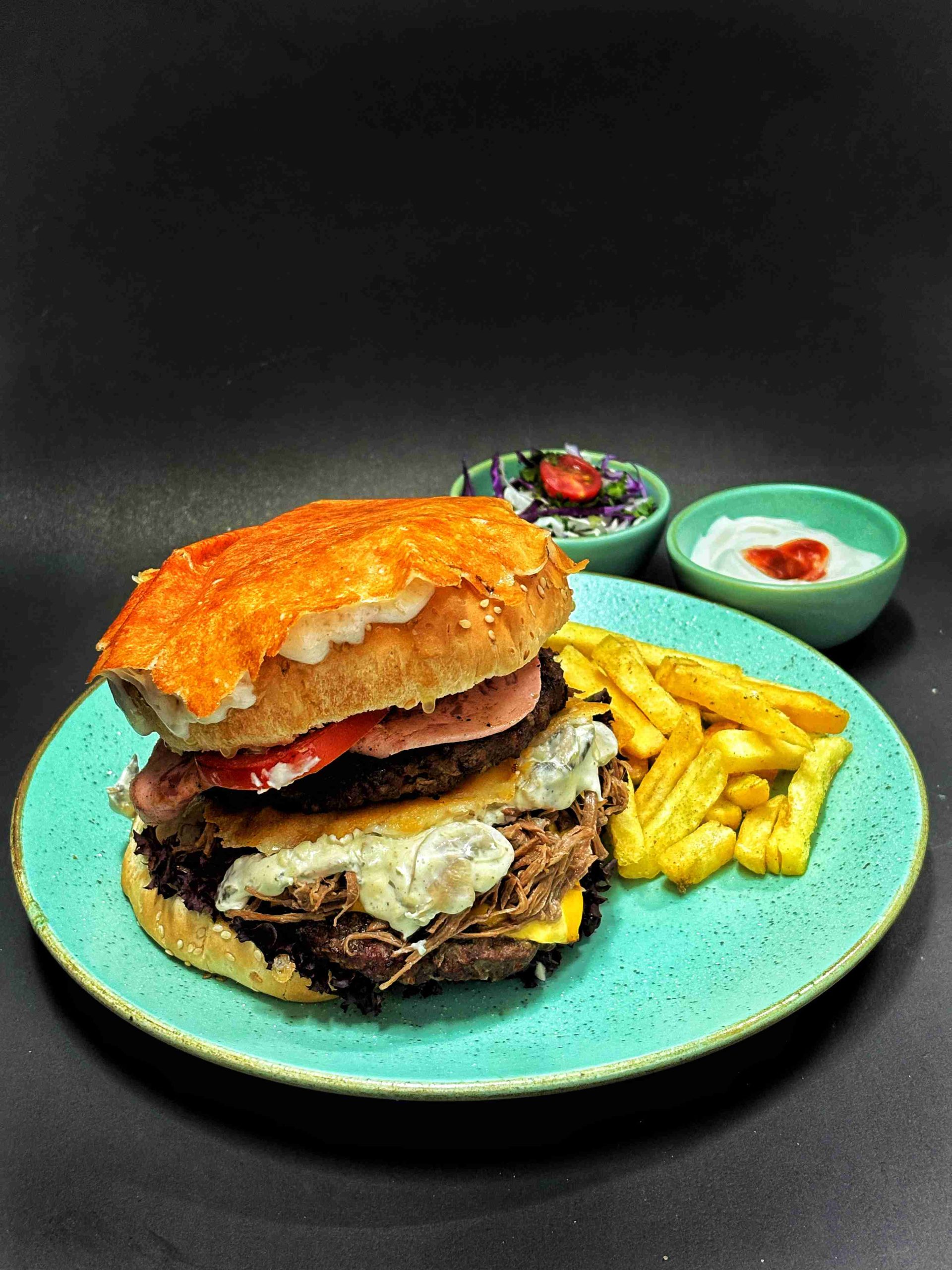 یک لایه برگر دست ساز ، با گوشت گوساله آبدار ، به همراه گوشت دنده آهسته پز ترکیب شده با سس مخصوص سر آشپز به همراه دورچین