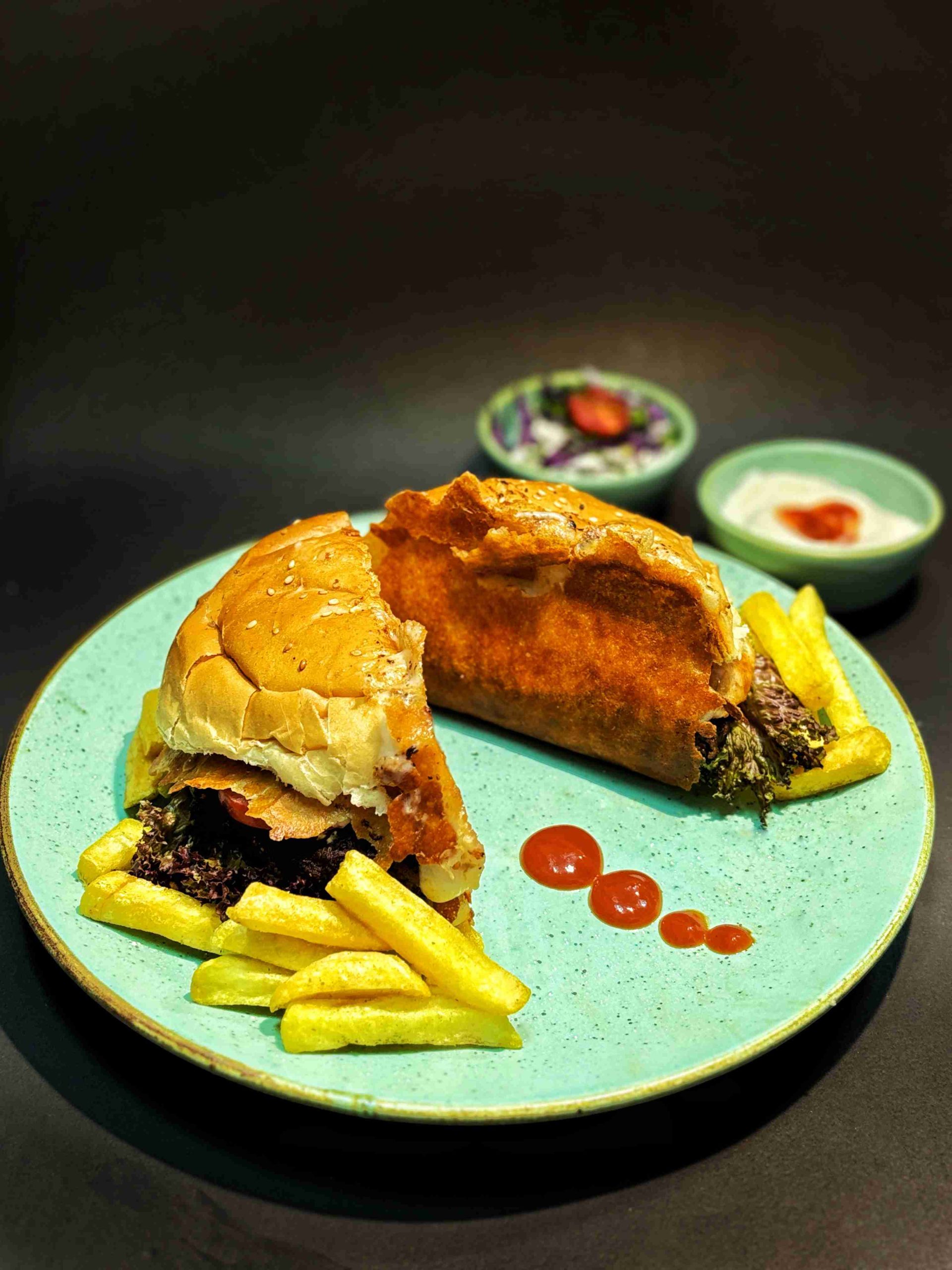 دولایه برگر دست ساز با گوشت تازه ، ترکیب شده با گوش دنده آهسته پز برای طعمی عمیق و ماندگاری همراه با سس قارچ خامه ای ، ژامبون گوشت پرمیوم و سس اختصاصی سر آشپز پیچیده شده در لایه ای از پنیر طلایی سرخ شده و دورچین