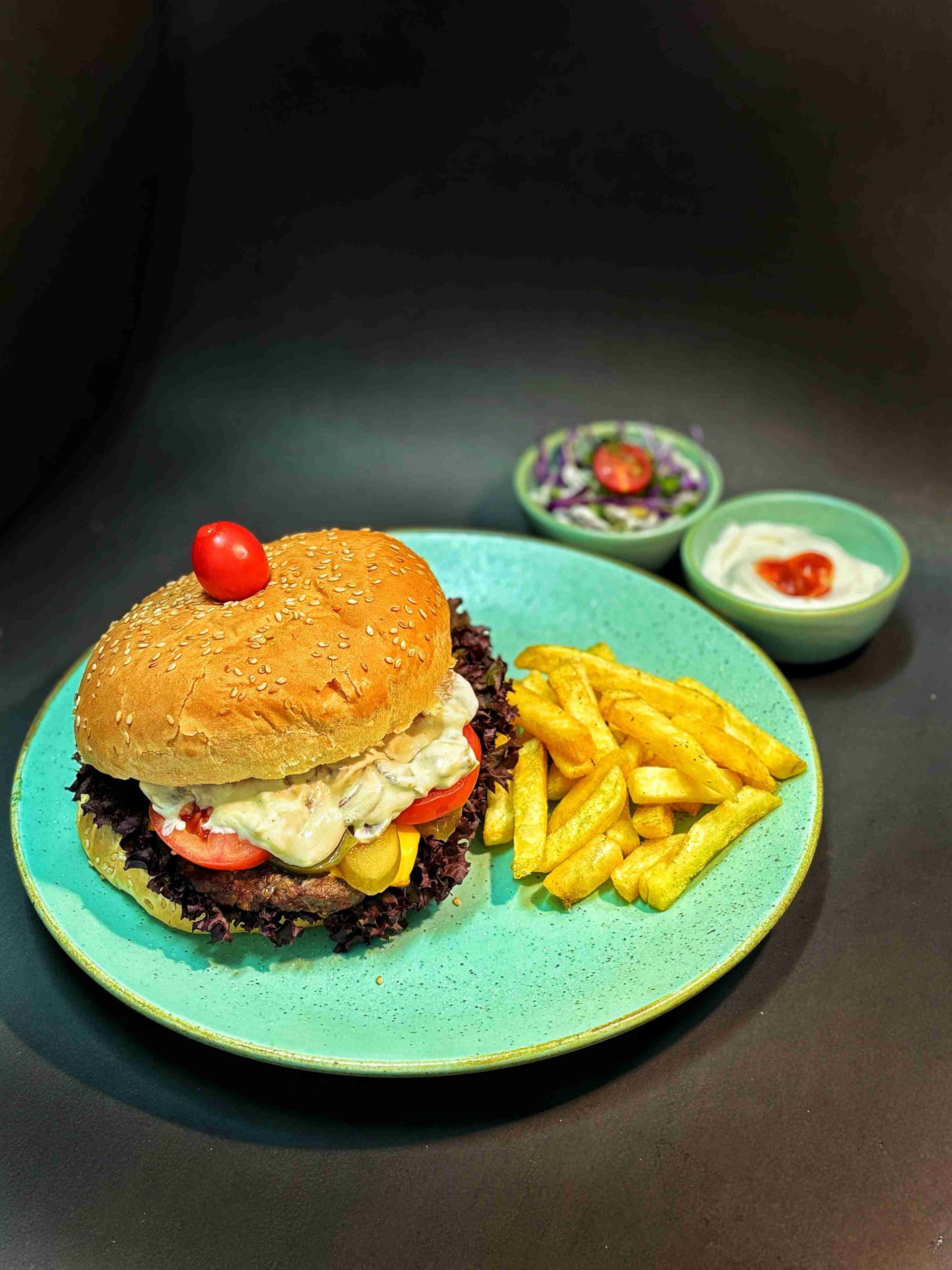 یک لایه برگر دست ساز به گوشت گوساله تاره ، به همراه سس قارچ و خامه لطیف بدون هیچ گونه افزودنی